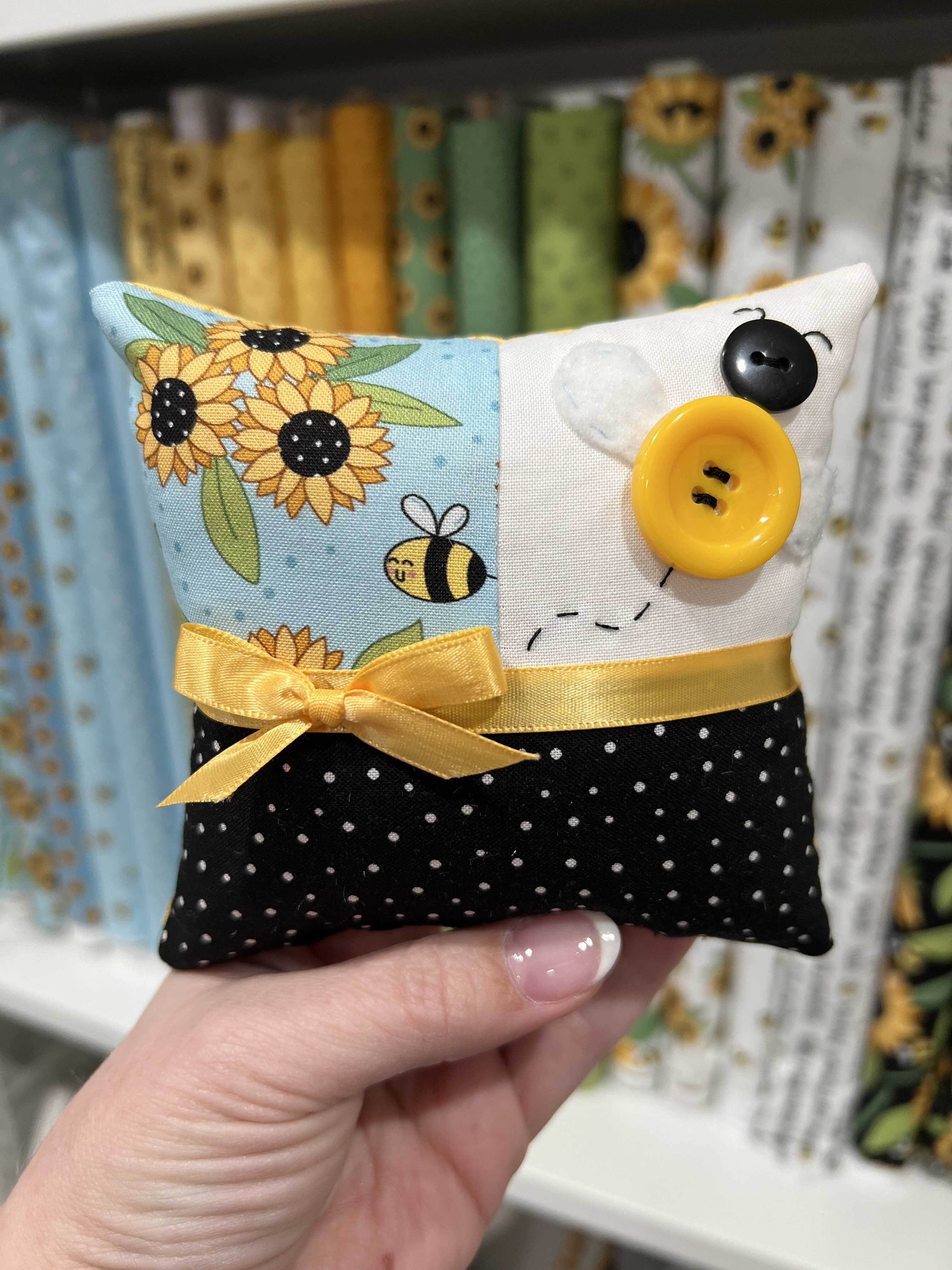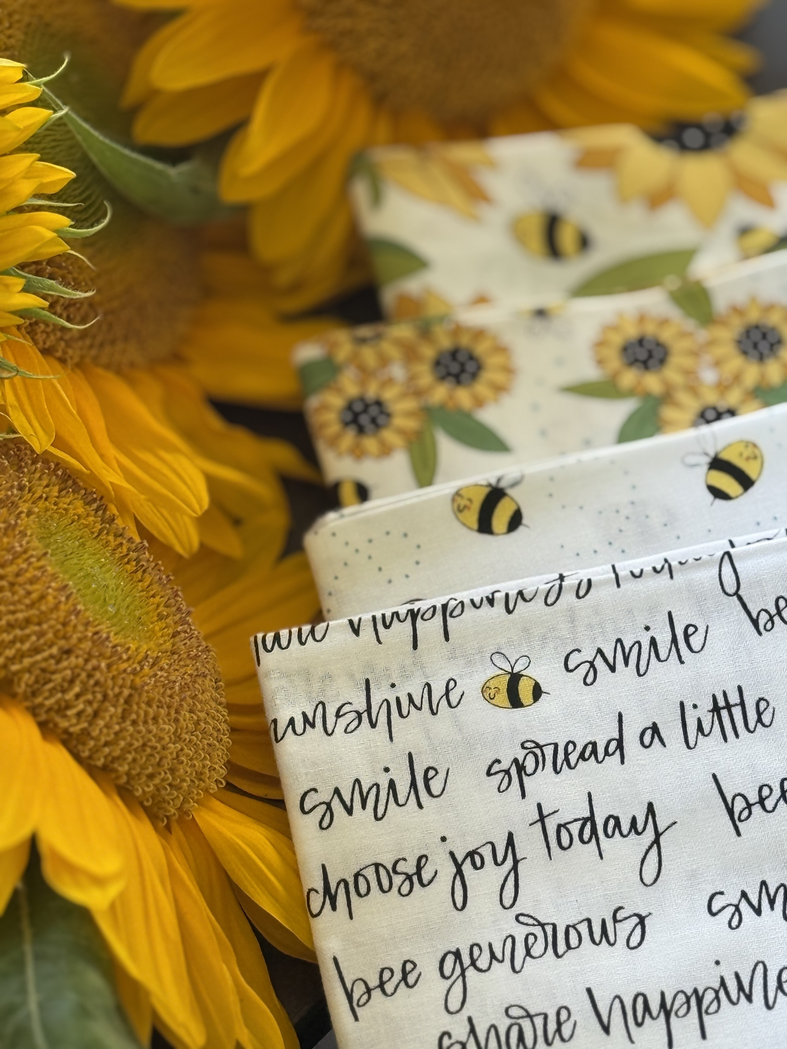 My most recent collection that's available in stores is Sunny Honey, which is a cheerful line based on sunflowers (my favorite!) and bees. While I love all 24 of the fabrics, if I could only choose one, I think I'd use "Sunny Bouquet" in blue. It has a light blue background, trios of small sunflowers, and fun little buzzy bees flying around in between. This particular pattern combines my favorite elements of the collection and I really love the shade of blue.